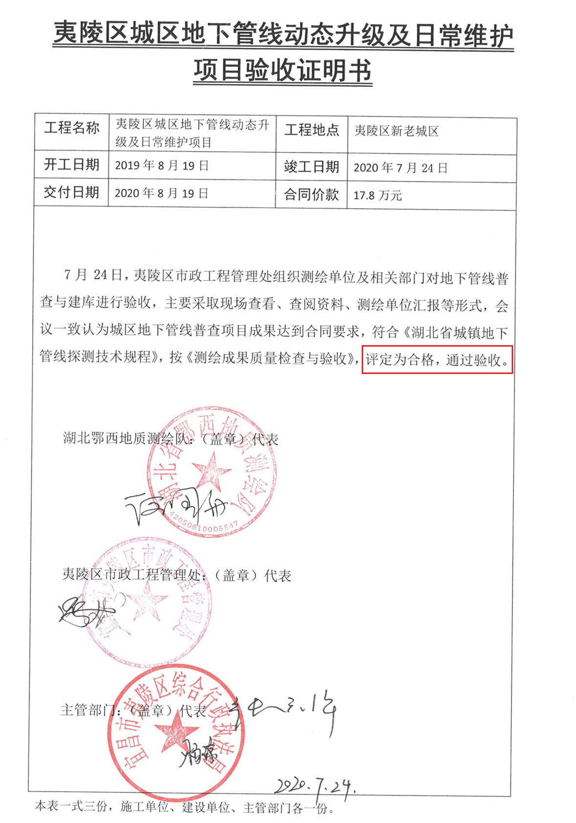 《2019年(nián)夷陵區(qū)城(chéng)區(qū)地(dì)下(xià)管線動态升級及日(rì)常維護服務采購(gòu)項目》于2019年(nián)7月(yuè)1日(r©ì)開(kāi)工(gōng),7月(yuè)30日(rì)竣工(gōng)。該項目經過我隊項目部作(zuò)業(yè)組及£質管部三檢(自(zì)檢、互檢、內(nèi)部檢查),于7月(yuè)24日(rì)通(tōng)過了(le)夷陵區(qū)市(shì)政工(gōng)程管理(lǐ)處的(de)•檢查驗收,測繪成果資料評定為(wèi)合格。
